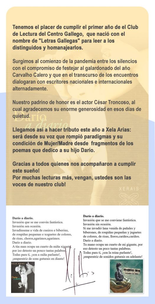 CENTRO GALLEGO los invita a acompañarnos a una nueva entrega del Club de Lectura en su segundo ciclo. Finalizando así el homenaje a XELA ARIAS con la lectura de uno de sus poemas.