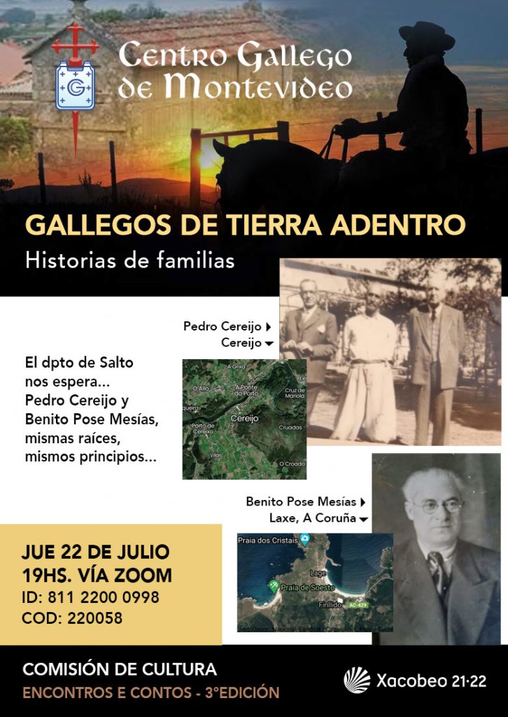 CENTRO GALLEGO – Comisión de Cultura«GALLEGOS DE TIERRA ADENTRO «Historias de familias. El departamento de Salto nos espera…Pedro Cereijo y Benito Pose Mesias mismas raíces, mismos principios… JUEVES 22 DE JULIO – 19 HORASVÍA ZOOM