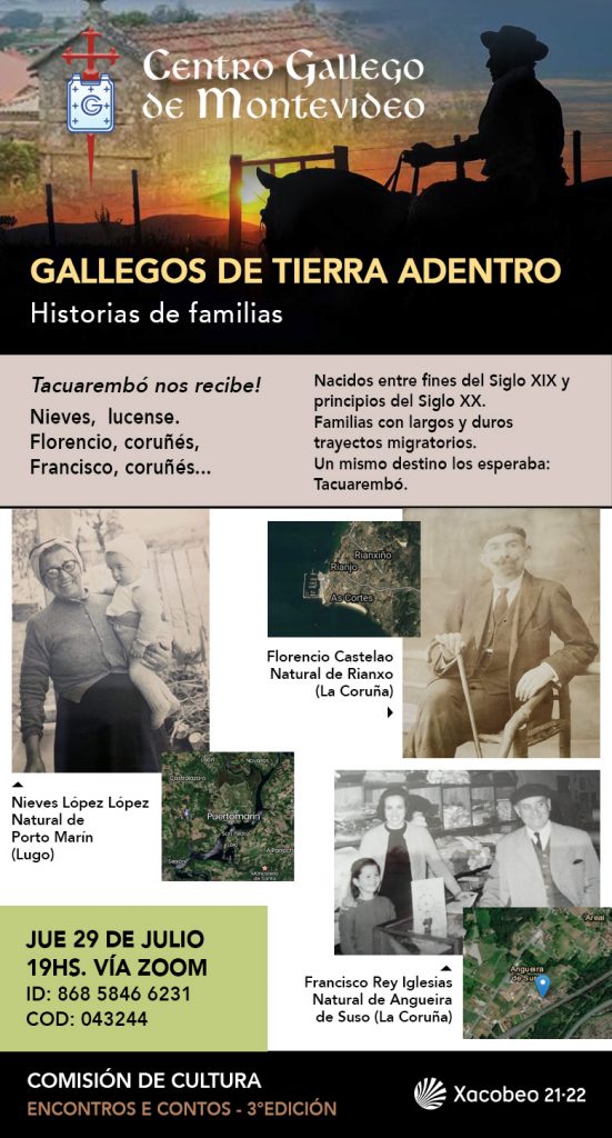 CENTRO GALLEGO DE MONTEVIDEO » GALLEGOS DE TIERRA ADENTRO «Historias de familias. BIENVENIDOS A RIVERA…Gallegos que inmigran a nuestro país y se radican en la frontera riverense.Con espíritu de superación y fortaleza. JUEVES 19 AGOSTO19 HORASVÍA ZOOM