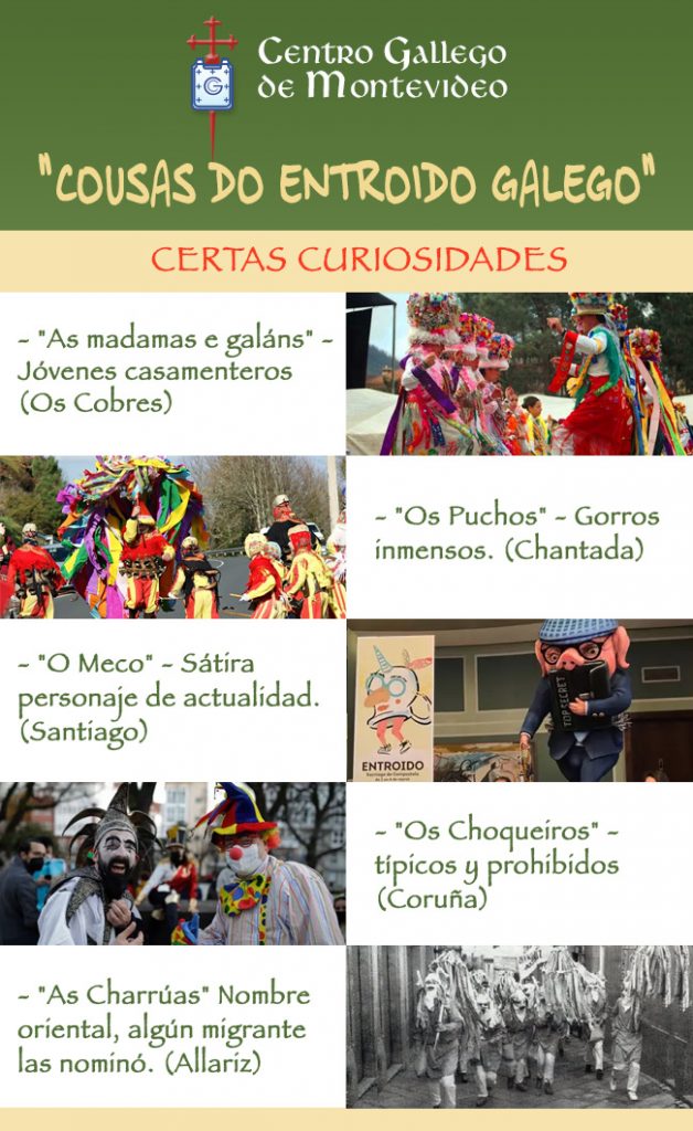 CERTAS CURIOSIDADES DOS ENTROIDOS… -En Os Cobres, «As madamas e galáns» buscan pareja en la fiesta.-En Chantada, «Os Puchos «son gorros inmensos formando parte del disfraz.-En Santiago, O Meco es un muñeco que satiriza a personaje de actualidad.-En Coruña,»Os Choqueiros «, personajes prohibidos y que ignoraron la prohibición.En Allariz, existen «As Charrúas»!!Quizás algún gallego migrante …