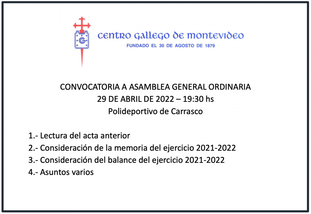 Asamblea General Ordinaria abril 18, 2022 septiembre 21, 2022 El día 29 de abril se realizó la Asamblea general ordinaria en el Polideportivo de Carrasco.